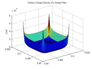 Developed code in MATLAB to discretely calculate the capacitance across charged plates. The code will then plot a graph, providing a visual representation of the charge distribution across the charged plates. This obtains a more accurate measurement of capacitance versus the approximation equation.